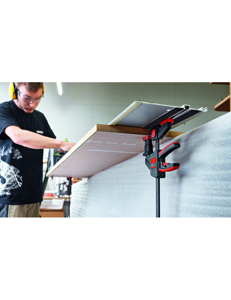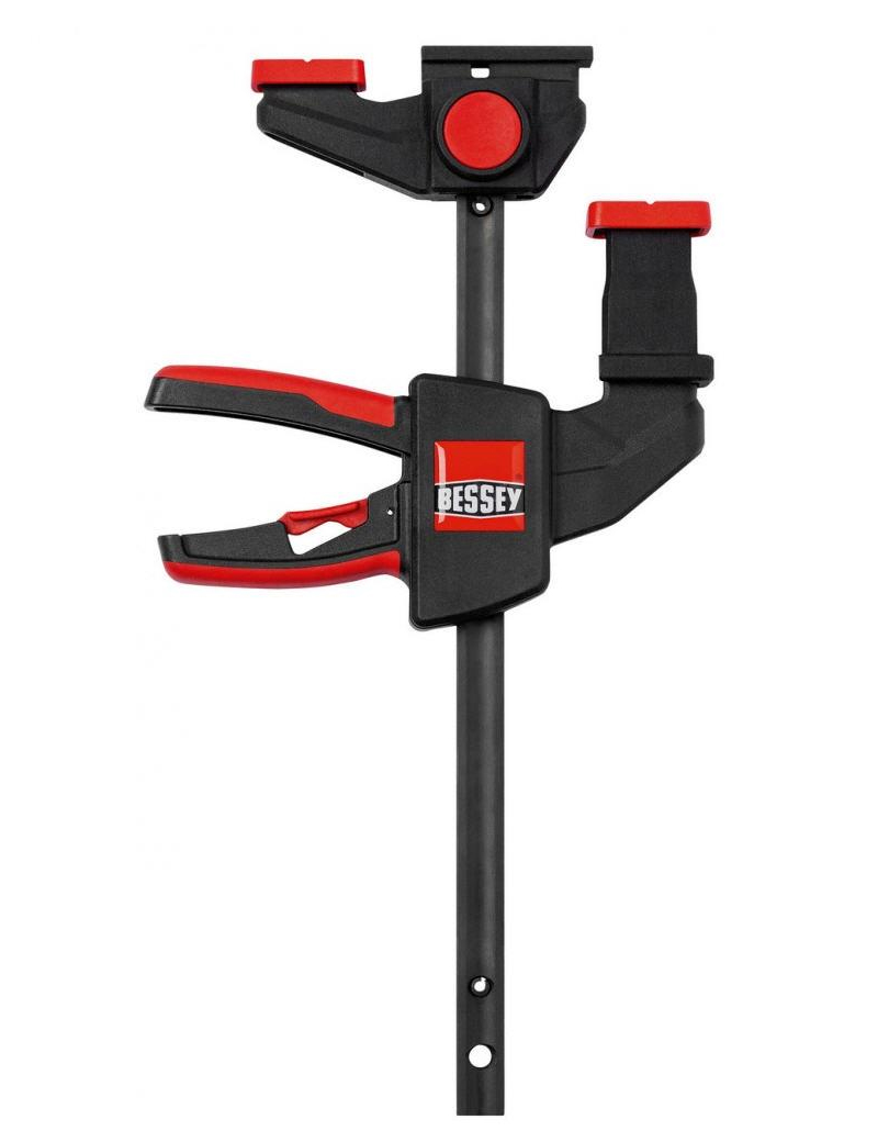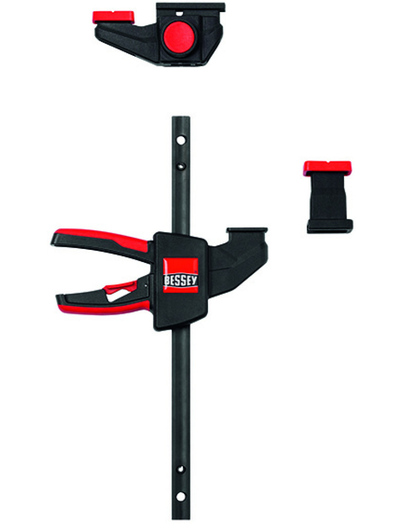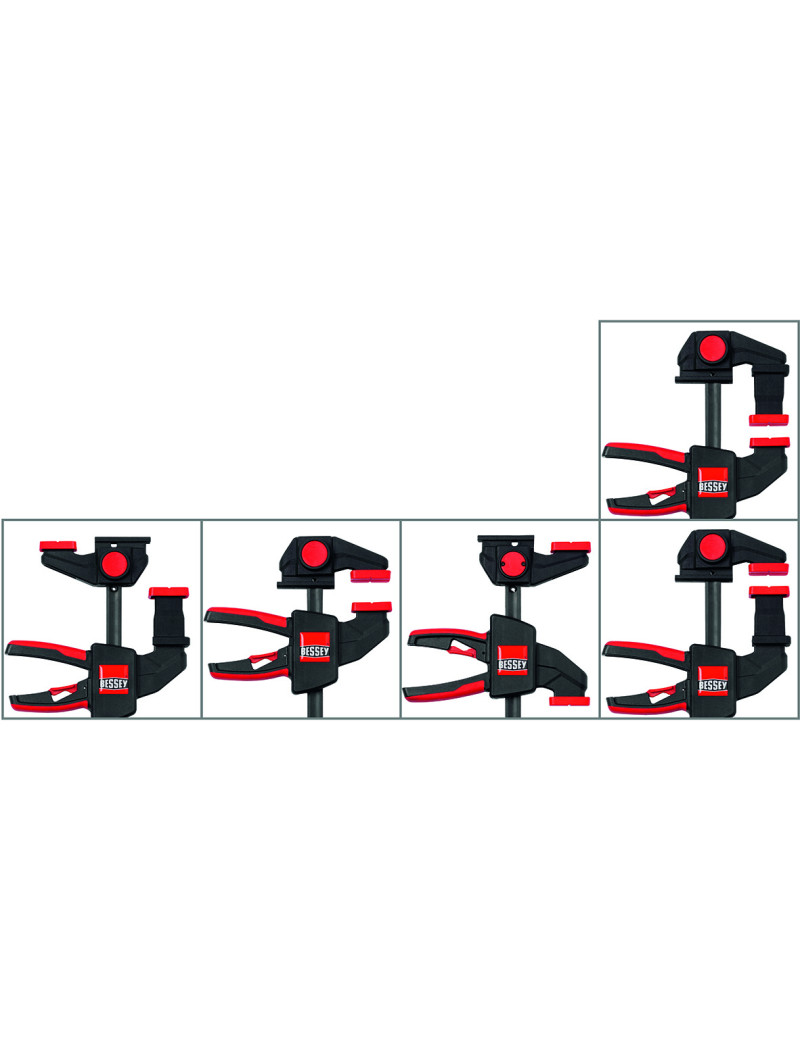 kvalitná plastová dvojkomponentná rukoväť na strane protiľahlej ramenám, s pákou posuvu, je bezpečne ovládateľná z oboch strán, uvoľňovacie tlačidlo, integrované v rukoväti, umožňuje povolenie zvierky a rýchle prestavenie klzného ramena, krížové prizma krytiek upínacích ramien umožňuje upnutie guľatých i hranatých profilov.