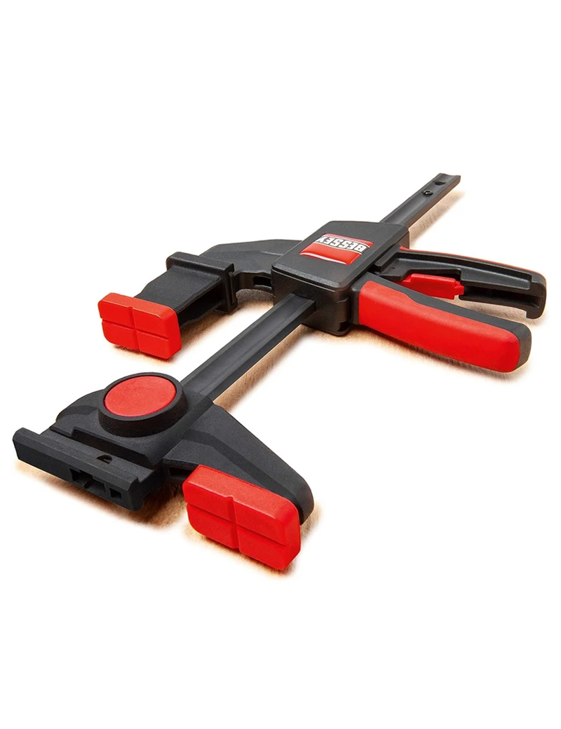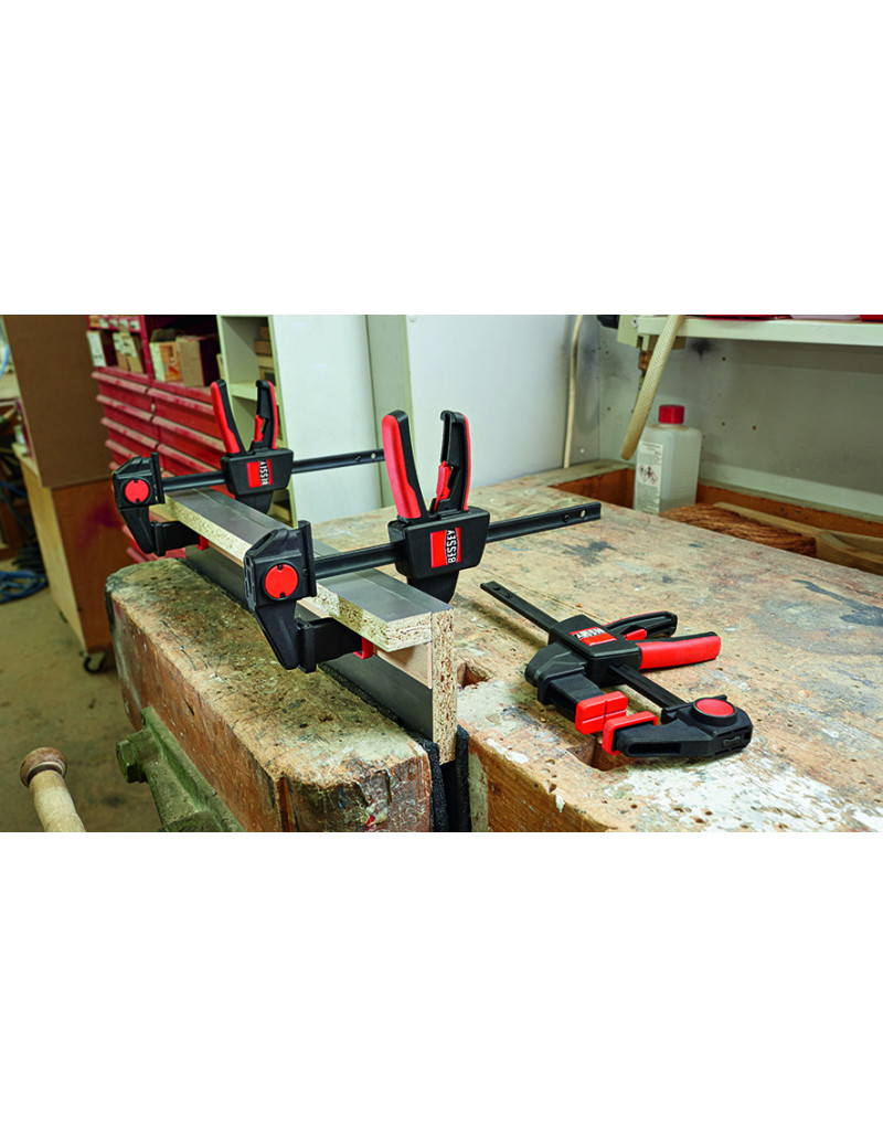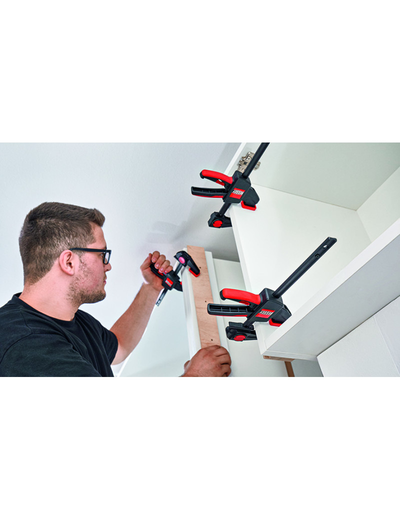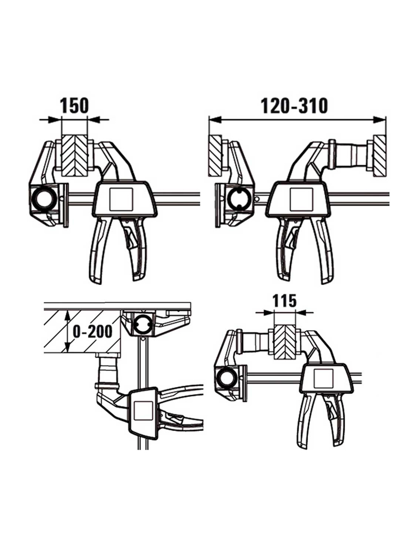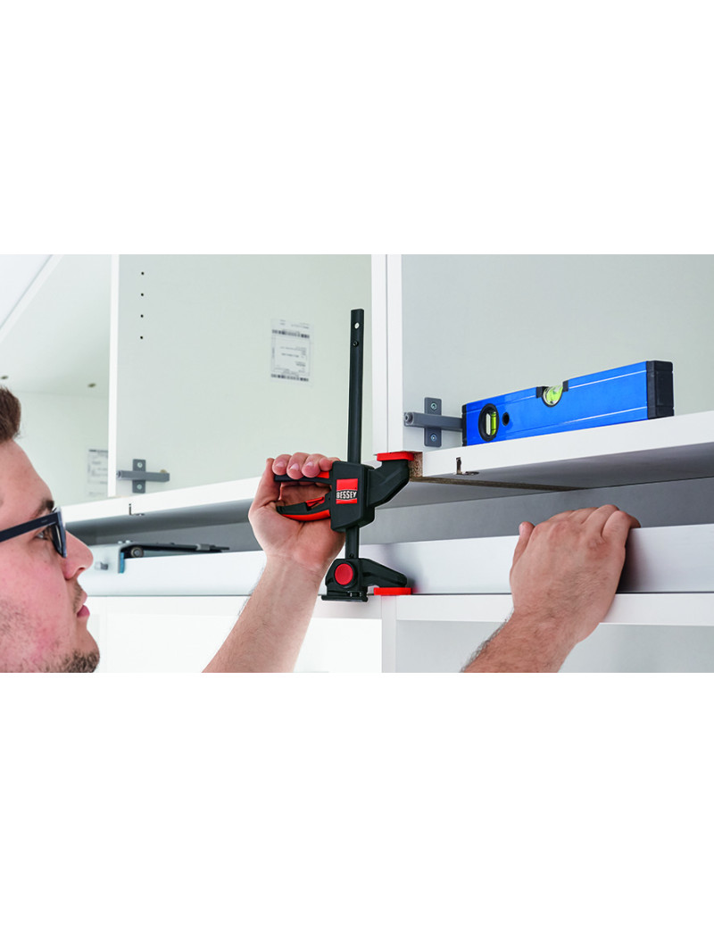 kvalitná plastová dvojkomponentná rukoväť na strane protiľahlej ramenám, s pákou posuvu, je bezpečne ovládateľná z oboch strán, uvoľňovacie tlačidlo, integrované v rukoväti, umožňuje povolenie zvierky a rýchle prestavenie klzného ramena, krížové prizma krytiek upínacích ramien umožňuje upnutie guľatých i hranatých profilov.