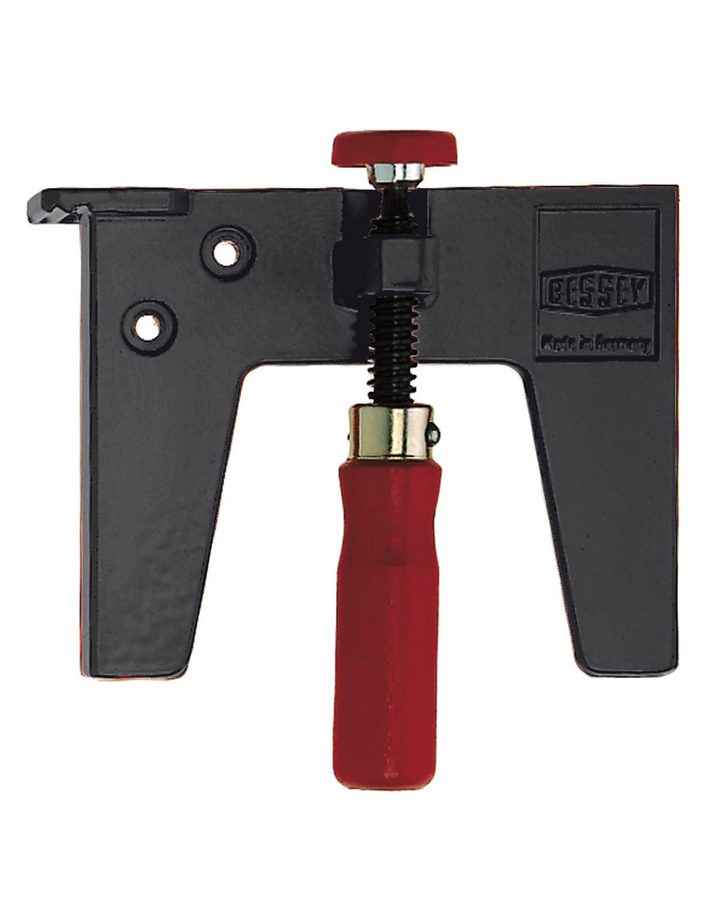 Pritlačenie dosiek k podlahe je zaistené prostredníctvom šikmo vedeného vretena s pohyblivo uloženou prítlačnou doštičkou s ochrannou krytkou